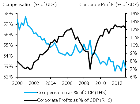 Barclays Capital: – During the recession and the subsequent recovery with its weak growth, companies have been aggressively managing their bottom line. They’ve refrained from hiring, raising pay or otherwise investing in business expansion. Compensation as a percentage of GDP has been falling since the end of 2008 and now stands close to a 13-year low.