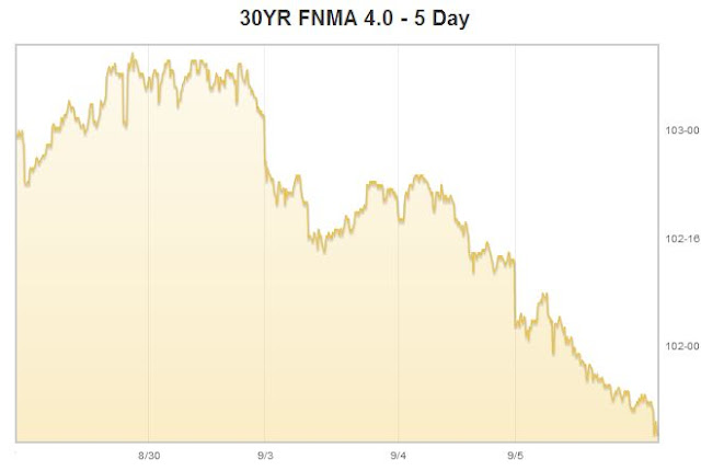 What’s driving this distortion? As the Fed prepares to reduce its purchases (which include MBS), agency MBS bonds are selling off. The latest price decline in fact has been quite sharp.