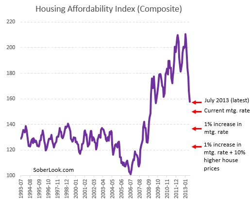 Scenario #3 shows how sensitive affordability is to these adjustments. It takes use below the pre-recession affordability average – a shock that would be quite difficult to for the current economy to absorb. Some would say this scenario is unrealistic. Perhaps. But mortgage rates are up some 1.5% from the lows in just a few months and house prices (based on the S&P Case-Shiller Index) are up 12% from a year ago. Was such a scenario realistic last year?