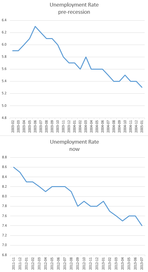 Both periods show similar trends in the unemployment rate, although the absolute levels are quite different. That, at least in theory, is usually the rationale to consider exiting stimulus.