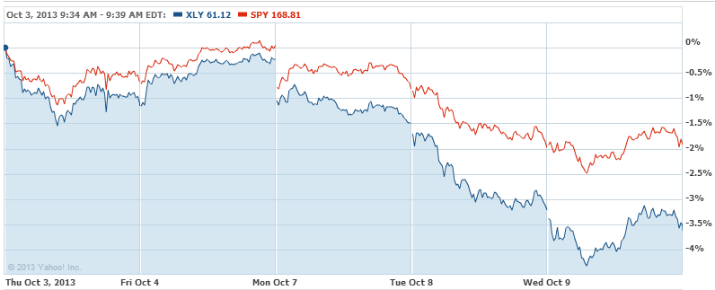 Typically we have a lag between a major shift in consumer sentiment and its full impact on spending. Perhaps a more timely indicator of consumer behavior is the stock market. And the stock market is telling us there is a real risk of slower spending growth ahead. The chart below compares the Consumer Discretionary Select Sector (XLY) with the overall market (SPY). The underperformance of consumer discretionary shares just in the last 3 days is quite clear. The government shutdown and the upcoming debt ceiling uncertainty is expected to negatively impact US consumer spending.