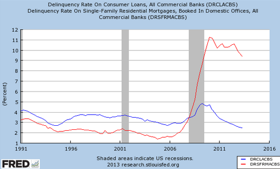 Just to put this in perspective, the following chart compares delinquency rates for consumer non-real estate loans (blue) with mortgage loans (red).