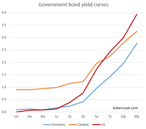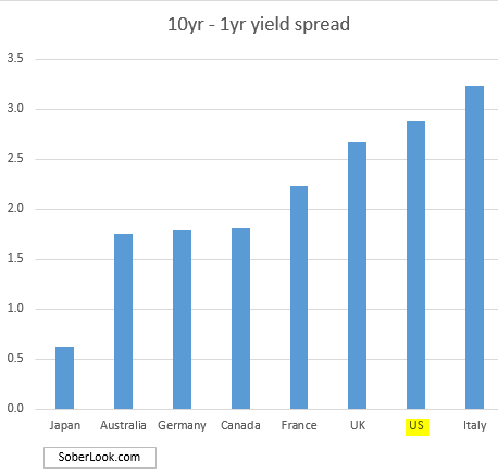 The only developed economies with steeper government curves are in the Eurozone periphery – the result of lingering credit concerns.