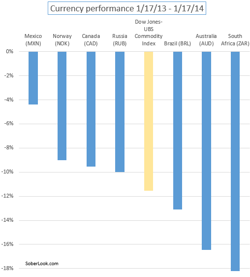 Some of the largest natural resource exporters with floating exchange rates have seen their currencies come under significant pressure over the past year.