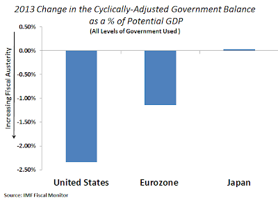 I put together the following figure using the latest IMF Fiscal Monitor. It shows the 2013 changes in fiscal policy for the three largest advanced economies. A negative number means fiscal policy tightened, while a positive one means it was expansionary: