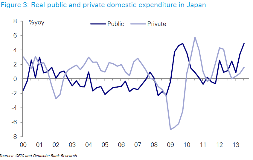 Initially private consumption surged in Japan on the back of the sharp rise in stock values which went hand in glove with the yen devaluation, rising by an annual 5.2% in March 2013. Subsequently it has fallen back and the rate of increase was just 1.1% in January, despite the “consume now” stimulus of a looming tax hike. In recent quarters what has most driven domestic demand has been private residential investment (in the anticipation that prices might finally start rising) and public spending on infrastructure projects as part of the “second arrow” stimulus programme (see chart below which comes from Deutshe Bank’s Michael Spencer).