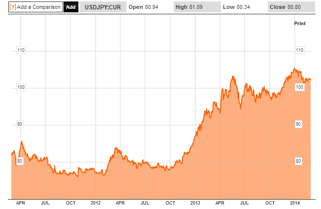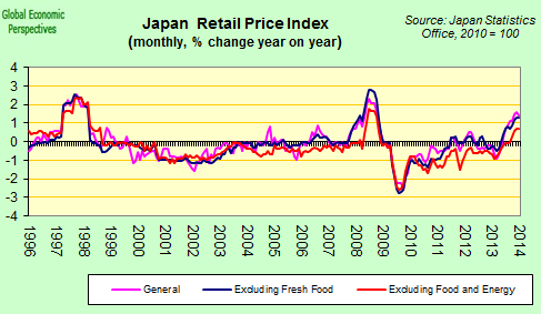 In this very context Takashi Nakamichi had a timely post on the WSJ blog last week. What is going to happen to Japanese inflation, he asks, if the yen does not undergo another significant depreciation? “Barring another major drop in the yen”, he points out, the earlier “exchange-rate effects will start to fade from this spring. Friday morning, the yen was trading around Y102 to the U.S. dollar – about the same level it was last May”.