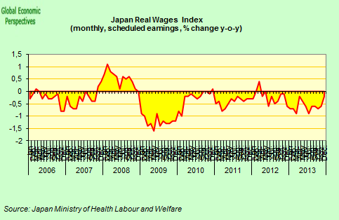 “Over the past 15 years, wages have dropped 15 percent. In the 11 months through November 2013, pay for the average worker rose only 0.2 percent. Households’ real income fell 1.7 percent in December from the previous year. Base wages, excluding overtime and bonuses, fell 0.2 percent in December, the 19th consecutive month they’ve dropped. The issue of wages, says Martin Schulz, an economist at Fujitsu Research Institute, “is a litmus test for whether Abenomics works or falls apart.””