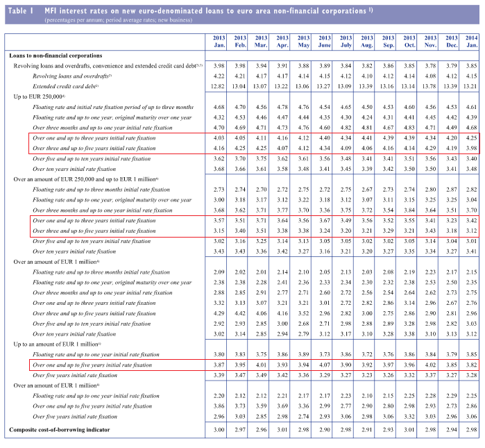 According to this, EMU average interest rates are now falling on SME loans (see circled area). But the ECB says that average interest rates on new lending to non-financial corporations are rising. How do we explain this discrepancy?
