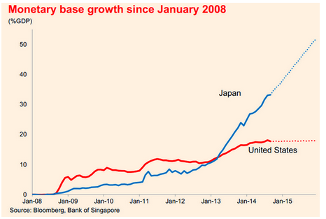 Without more tax hikes last April’s increase will simply drop out of the inflation data by the time we reach next spring, and absent the implementation of the Abenomics 2.0 yen devaluation the currency-depreciation-induced inflation was already dropping out. The first round of Abenomics took the yen from 75 to 100 to the USD, the current bout has now taken it to around 115, but to keep injecting inflation in this way Kuroda would have to keep increasing the rate of balance sheet expansion on an annual basis and the yen would have to keep falling to lower and lower levels.