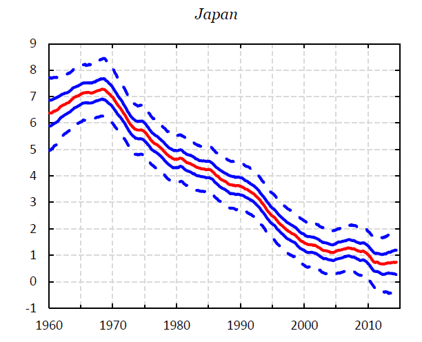 On analyzing their results they found an extremely persistent slowdown in long run growth rates for the G7 as a whole. More surprisingly perhaps, it looks like this slowdown has been ongoing since the 1970s, and is not just a sudden decline after 2008. Averaged across the G7, they traced the slowdown to trend declines in both population growth and labour productivity growth, with the combined impact being a halving in long run GDP growth trends from over 4 per cent in 1970 to just 2 per cent now.
