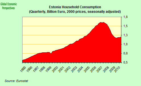 “Estonia’s recovery has been mostly driven by exports, which, measured in current prices, reached close to the all-time high in September”, and “Export growth indicates that the economic activity of our main export partners is expanding quickly and Estonia’s companies are making good use of it…. The export volume of industrial production reached a historical high in the third quarter. Irrespective of the continuously weak domestic demand, the sale of industrial production started to pick up in the domestic market as well, but it is still some 25% below the pre-crisis level…. since unemployment continues to be high, the level of consumers’ income and purchasing power will remain weak in the next years”.