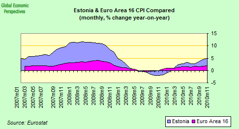 Added to this, the way that fiscal austerity was implemented (raising VAT, and fuel costs) has meant that the Estonian price level, far from continuing to deflate (which is what is needed to increase competitiveness quickly enough) is now rising again, and at around 5.5% (my estimated HICP, the Estonian CPI was up 5.7% but the weightings are different) is well above the 2.2% estimate for the Euro Area, or the 1.9% December inflation estimated for Germany by the Federal Statistics Office. Perhaps one of the clearest indications of the malfunctioning of the Eurozone as currently structured is that the Germany economy (which is recovering rapidly) is experiencing far higher levels of inflation than the Eurozone periphery, which in theory should be deflating to recover competitiveness.