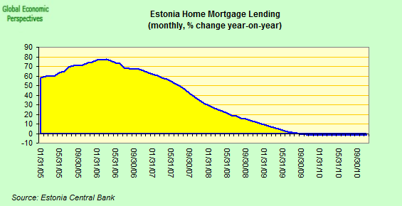 The domestic construction sector isn’t recovering either. According to Statistics Estonia, the total production of Estonian construction enterprises increased 1.2% in Q3 2010 compared with a year earlier. But when you read the fine print, the increase was entirely produced by construction companies operating abroad (whose activity was up by 25%) – ie once more it is a question of exports.