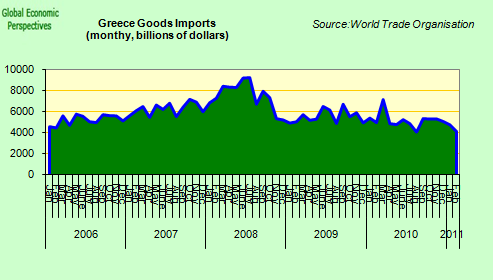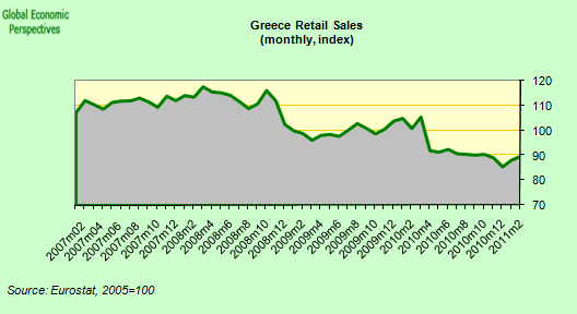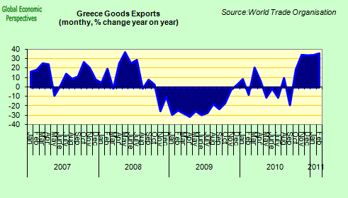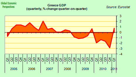 Many an economic eyebrow must have been raised last Friday when Europe’s first quarter GDP data was released, and people discovered that the Greek economy had suddenly surged forward, rising by 0.8% over the level it had attained in the last three months of 2010 (or at a 3.2% annual rate, or faster than the US). Since almost everyone with knowledge of the situation is forecasting a further contraction in the economy this year, the result may have been thought to be a surprising one.