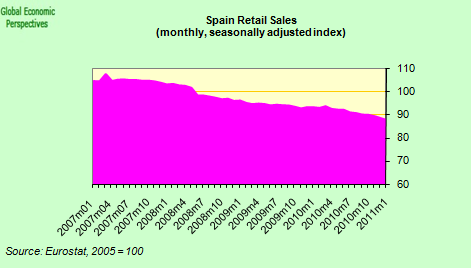 In theory the Q1 performance marks an acceleration over the 0.2% quarterly rise registered in the last quarter of 2010. Such an acceleration seems odd, since all the recent data, industrial output, retail sales, unemployment has been negative, and doubly so since the government is in the process of a very sharp (3.2%) fiscal adjustment process.