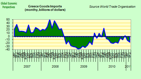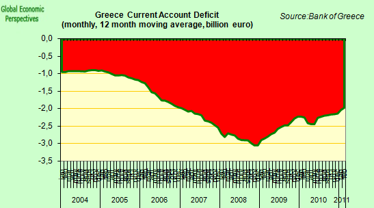 In countries running an ongoing trade and current account deficit, the rise in living standards which comes from an increasing excess of imports over exports figures in national accounts as an output negative (apart from the transport and retail outlet activity which are a spin-off), and the counter party to all that “living beyond our means” feel-good added credit-driven purchasing power really only shows up as a negative item on the financial side of the accounts, as money borrowed from the exterior, money which is used to finance the deficit. It is a negative item, because all that potential capacity to spend is being diverted away from national activity to external activity. So while you pay for the products consumed (through debt) others get the long term benefit of your spending. Which is why it is such a bad idea to run sizeable current account deficits over any great length of time, since they are financed by credit, and credit is only a way of transferring demand from the future to the present, which means you will feel richer now, and poorer in the future, and this is exactly what is happening to Greece. It is also why the only way to put the situation straight is to export more, and run a trade and current account surplus, since then the value of your net external debt falls. So the correction is necessary and inevitable, although the curious thin is that while it is taking place, and while exports are rising and imports and living standards falling GDP rises, even though people feel much worse off.