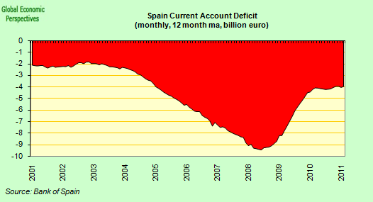 This is a much milder version of the Greek story, but possibly similar processes are at work in both cases, as Spain’s previously large current account deficit is also being steadily forced to close.