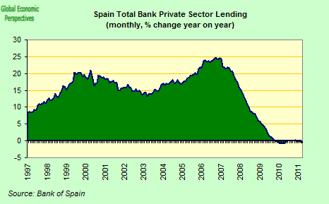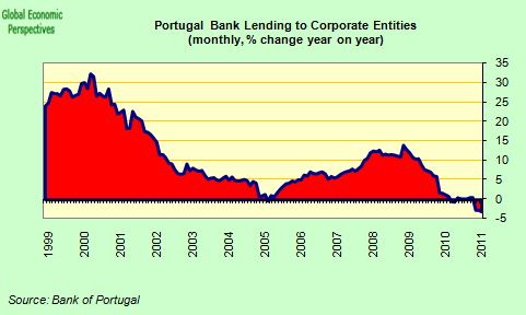 In fact Spain is not unique in this sense, even if the country does offer a somewhat dramatic example of a larger problem. Credit conditions in Portugal are also now tightening, and demand for loans is falling.