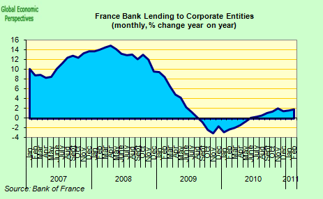 Indeed, the low interest rate policy of the ECB during the crisis really does seem to have worked in the Finnish case, in that housing demand and private consumption never really collapsed (see this earlier post on the property boom in Finland). Finally, in this brief survey, there is France, where even though corporate borrowing remains restrained, demand for consumer and housing credit seems to be really kicking back to life.