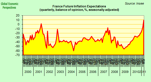 Evidently France is becoming a very special case, since France’s private sector is not heavily indebted, although looking at its comparatively young population profile it could easily become so. If there is one country where a property bubble could be produced, that country is France – for both demographic and low-indebtedness reasons (just look at the line of take-off for household mortgages in the above chart). So evidently, at least in the French case ECB tightening makes perfect sense, as it does when we look at the inflation expectations chart.