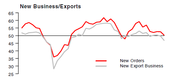 New business rose at the weakest rate since November 2009, led by the first (albeit small) decline in manufacturing new orders since July 2009 (see chart below). New export orders for manufactured goods rose only modestly, posting the smallest increase since September 2009.