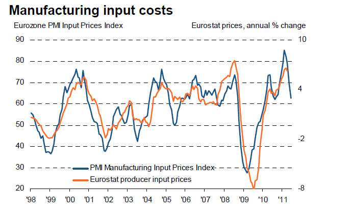 At this point detailed information is only available for the French and German economies, but there is little doubt that the pace of the slowdown in the core will mean that the peripheral economies are about to experience a double dip (and particularly worrying in this sense is the way Italian growth has been drifting downwards) and may well fall back into recession (in those cases where they have not already done so). Outside of France and Germany, manufacturing output (the PMIs are composite diffusion indexes, and the headline reading measures the aggregate of various components of which output levels are only one) fell for the first time since November 2009, with the rate of decline being the fastest since September 2009. So this is nothing to be sneezed at! As can be seen from the chart below, in all cases indicator readings are falling, but in the periphery case they are falling into recession territory.