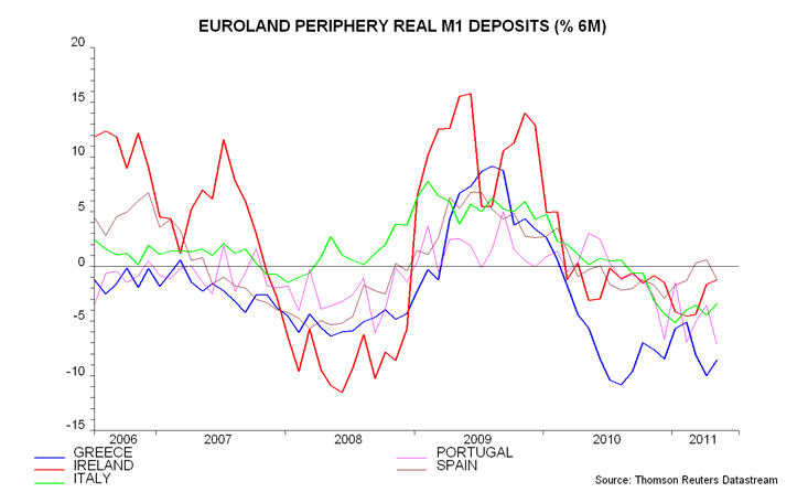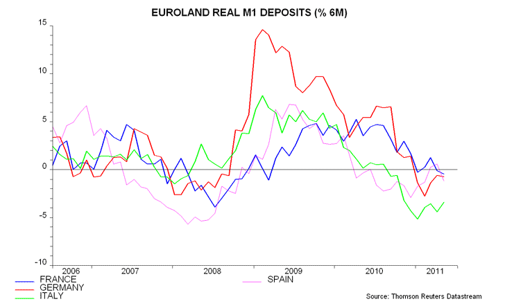 As Henderson Global Investors’ Simon Ward points out, in late 2010, while real (ie inflation adjusted) current bank deposits were contracting in Spain and Italy, they were still growing robustly in both Germany and France, implying a solid economic growth economic outlook in the core for the first half of 2011 (this monetary indicator is often thought to give an indication of activity with a 6 month lag).