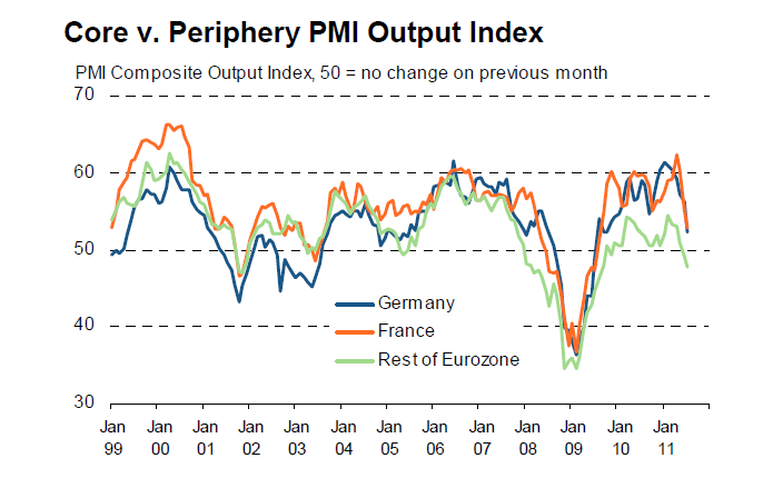 As Europe’s leaders struggle to convince markets that their Greek debt problem-resolution-proposals are actually viable, and will really do the trick, last week’s flash PMI readings seem to have attracted rather less attention than they might. Nonetheless, the fact of the matter is that it is steadily becoming clearer that the current slowdown in Eurozone economic growth is turning into something more than just another one of those pesky “soft patches”. The pace of economic expansion in core Europe has slowed dramatically, falling back in July for the third consecutive month, according to the latest flash PMI. Commenting on the flash results Chris Williamson, Chief Economist at Markit said: “The Eurozone recovery lost almost all of its momentum in July, recording the weakest growth since August 2009 when the recovery first began. Excluding the financial crisis, the July survey was the most downbeat since the Iraq war in 2003, and consistent with a flat trend in quarterly gross domestic product.