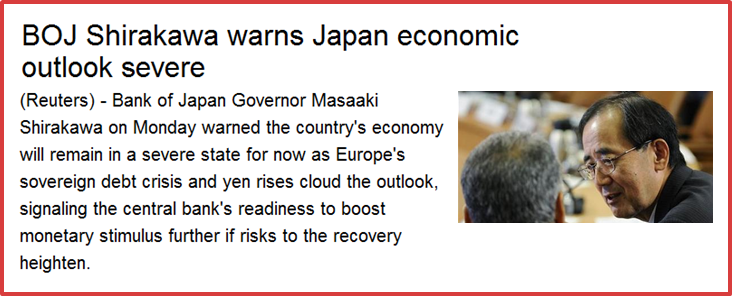 In fact, far from having the “V shaped” recovery from the Tsunami some (not me) were predicting the short term outlook for the economy seems pretty dire. Policymakers in Japan still attempt to pin the problems down to confidence issues stemming from the Euro debt crisis and the high value of the yen, but surely what has been happening in Japan over the last 20 years has something more than local interest, since it was a harbinger of things to come elsewhere.