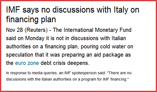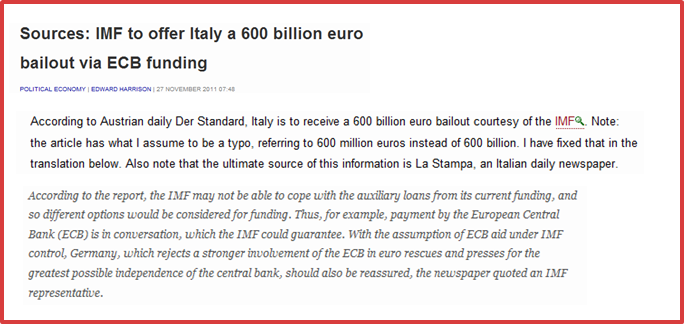 In fact the solution Europe’s leaders are likely to come up with involves some variant of all of these. As I suggested in my last piece, the ECB is desperate to go so far and no further. This is understandable given that no central bank likes the idea of finding itself having to show losses. Just how far the bank is prepared to go in order to avoid this is made plain from the rumour circulating this weekend that the IMF was readying up 600 billion Euros to lend to Italy. Just where the IMF was going to find the money was not explained by most of the sources, but thanks to a speedy translation from Edward Harrison at Credit Writedowns, we discover that it was another one of those cockamamie schemes whereby the ECB would actually lend the money, but the IMF would guarantee all the risk. Which simply begs the question; is there no one in Europe willing and able to guarantee the risk? And if not, why not? A stunning silence from Berlin.