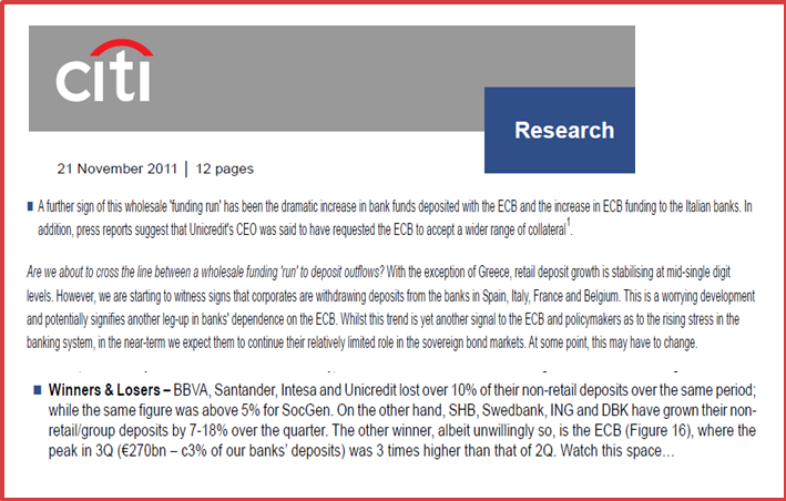 On the other hand Citi’s European Research Team are on “deposit watch”, and claim to see signs of deposit outflows from periphery to “core”, not retail deposits but corporate ones.