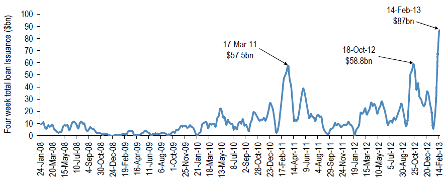 JPMorgan: – … the number of covenant-lite deals priced in the leveraged loan market also remained heavy. Specifically, covenant-lite loans accounted for 41% of issuance this week ($10.5bn), which followed $18.9bn (53%) last week, $14.7bn (47%) in January, and $58bn (51%) in 4Q12.