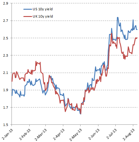 As a result of this 7% trigger on unemployment and stronger economic data out of the UK, the 10y gilt yield has risen much faster than the 10y treasury in recent days. The BoE governor has also emphasized that any rise in inflation will override the long-dated forward rate guidance (the so-called “inflation knockout”), making gilt investors uneasy.