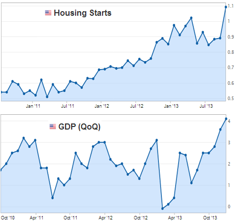 The trade that takes advantage of this view is the so-called “steepener” trade – long short-term treasuries and short long-term treasuries. And that’s how the market was positioned going into the announcement. But a combination of the “early” taper, stronger than expected economic data (below), and a less than stellar 5-year note auction made some question the #2 assumption above.