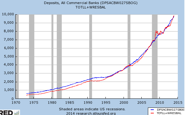 | Red = loans and leases + bank reserves, Blue = deposits (all commercial banks) |