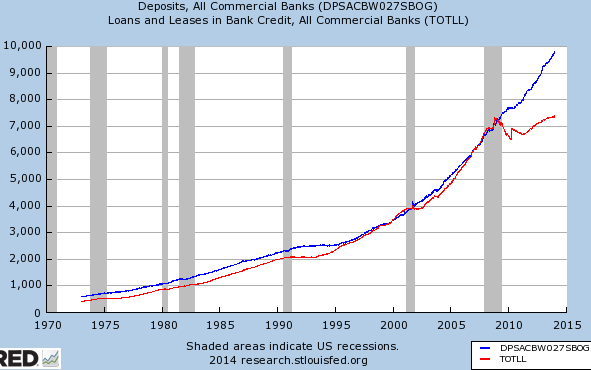 There are arguments to be made for all four. The last one however is particularly intriguing because the $2.4 trillion gap between deposits and loans is a familiar number. The excess reserves in the banking system is now … also around $2.4 trillion.