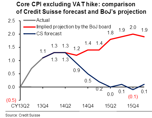 Representatives of the Bank of Japan continue to insist that the country is on course to exit deflation, but many external observers aren’t convinced, as this recent chart from analysts at Credit Suisse suggests.
