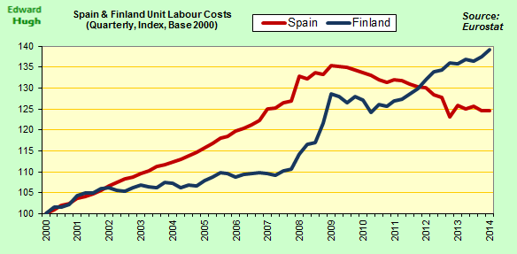 The chart is slightly misleading, illustrating just one more time how there is no such thing as an economic “fact”, since he has rebased the index to 2007, just when Spanish unemployment started to rise much more rapidly than measured GDP fell, provoking a substantial downward adjustment in ULCs. So Spanish and Finnish ULCs have seriously parted company, but not by as much as the chart suggests, since in 2007 Spain’s ULCs had grown to absurdly high levels.