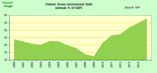 Leaving the Euro – which I think no one is suggesting – wouldn’t be an advantage, since apart from losing the firepower of a large central bank for the debt scenario, the country would be unlikely to achieve meaningful devaluation. All the other Scandinavian countries are currently having to fight hard to avoid revaluation – largely due to being neighbours of the ECB – as I explain in my post on negative interest rates. The old debate about having monetary policy sovereignty is a bit out of date, especially at a time when even Janet Yellen is hesitating to raise rates due to concerns about the currency impact of ECB action. How much more would a small open economy like Finland be at risk?
