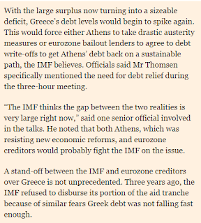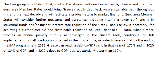 <p>In order to understand what is going on between the Eurogroup and the IMF it is necessary to go back to a 2013 document entitled: The Third Review Under the Extended Arrangement Under the Extended Fund Facility (what a mouthful that is, henceforth the Third Review). In particular the following paragraph in that document off a key:</p>