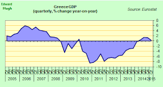 <p>It is now clear that Greece’s economy has been going backwards over the last 6 months, and that it has once more fallen back into recession. Greek GDP fell by 0.4% in the last three month of 2014, and by a further 0.2% in the Jan – March 2015 period. As a result at the end of March Greek GDP was only 0.3% above the year-earlier level. This is a lot lower than expected in IMF forecasts, and – perhaps more importantly – well out of line with what is needed to maintain the 2022 debt sustainability targets on which continuing Fund support for Greek programmes depends.</p>