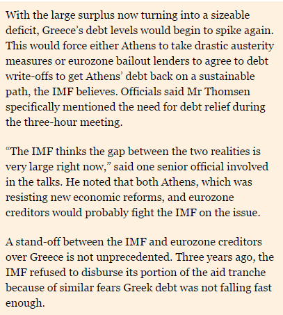 <p>Indeed “Greece is so far off course on its <a href=”https://www.ft.com/cms/s/0/520ec4f0-f004-11e4-bb88-00144feab7de.html?siteedition=uk”>€172bn bailout programme</a> that it faces losing vital International Monetary Fund support unless European lenders write off significant amounts of its sovereign debt”, <a href=”https://www.ft.com/intl/cms/s/0/72b8d2ae-f275-11e4-b914-00144feab7de.html#axzz3aHdRghat”>Peter Spiegel wrote</a> in the Financial Times on 4 May 2015. The reason for this is obvious: IMF regulations prevent the Fund continuing to make tranche payments to countries where there is a foreseeable financing shortfall during in the coming twelve months. The worsening in the Greek economic outlook and the consequent reduction in the revenue outlook effectively guarantee this shortfall.</p>