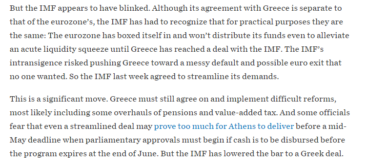 <p>The inter-institutional tensions are evidently reaching a critical stage, although in fact the issue has now been knocking around for some weeks,<a href=”https://www.wsj.com/articles/standoff-between-greece-and-creditors-over-bailout-deal-tests-imf-1429743220″> as Simon Nixon reported in the WSJ</a> on April 22.The IMF, he said, “appears to have blinked”.</p>